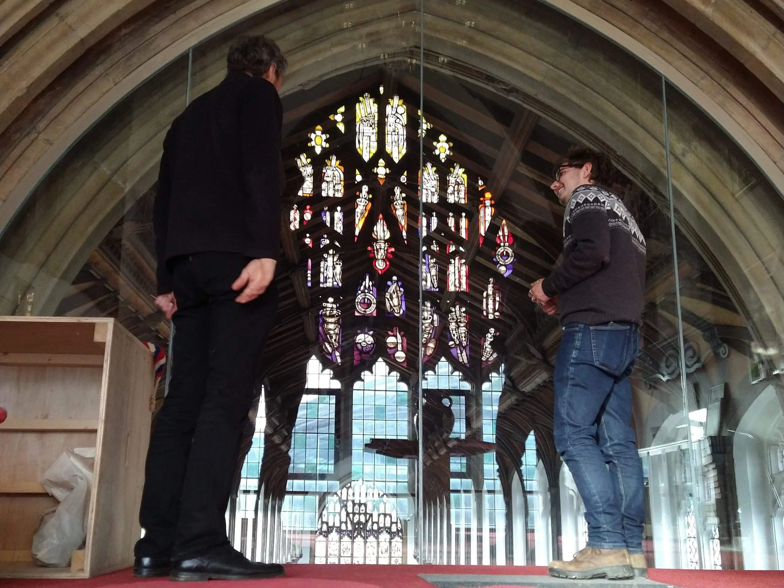 Inside the ringing chamber is the gorgeous Western stained glass window - in my opinion a tasteful balance of modern and historical, with a sense of a sunset about it in the gradient.
